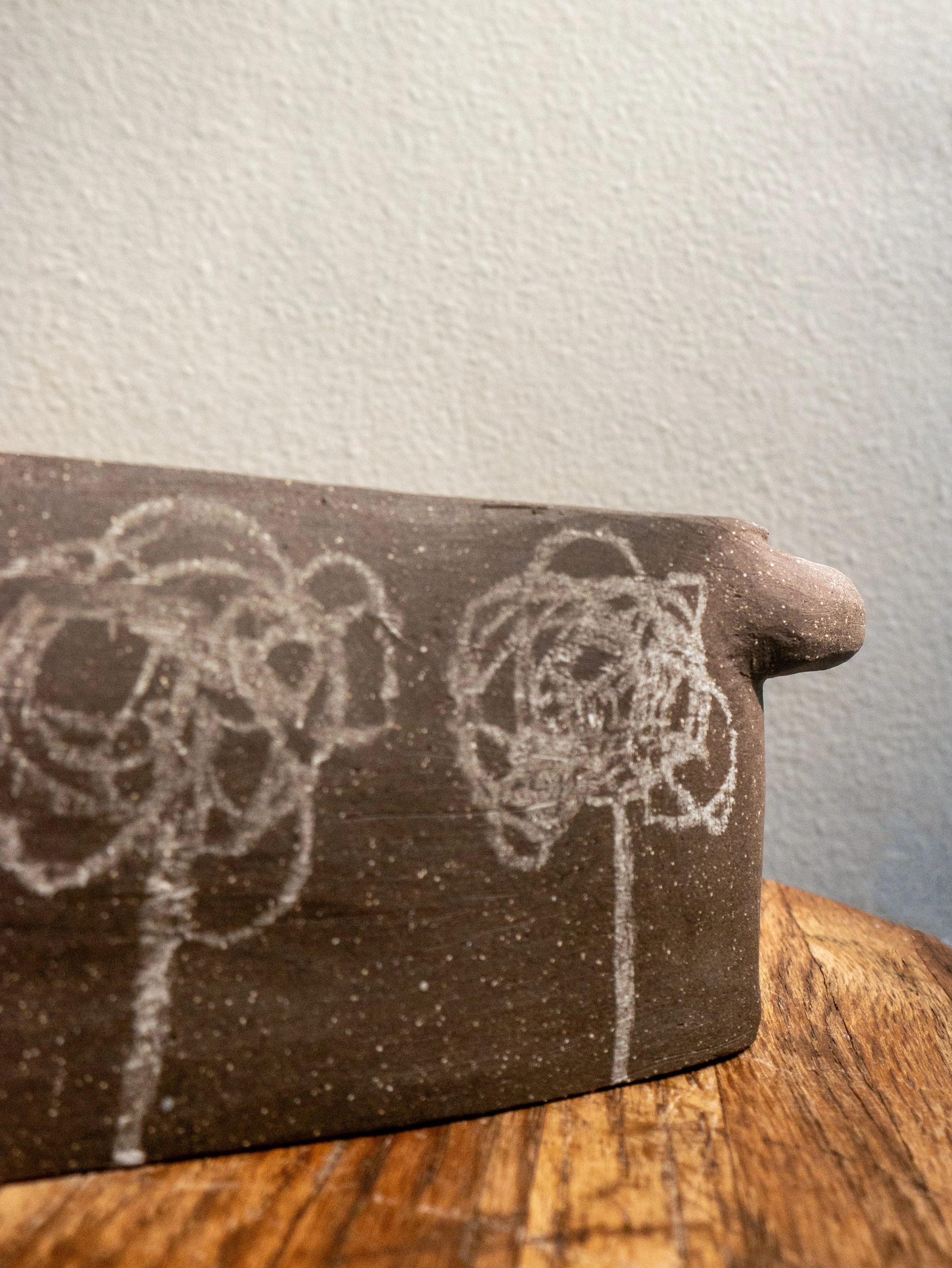 Black stoneware, two handled container with flowers hand drawn by the meticulous eye and delicate hand of a 6-year-old.